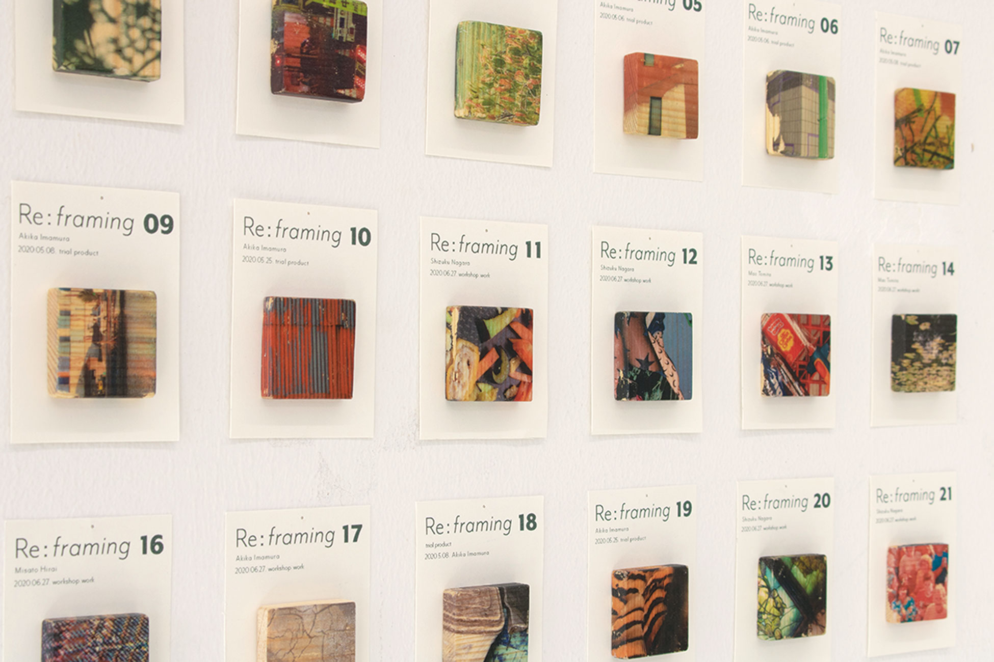 「なにげないものが違って見える、ちょっとおもしろくなる」をコンセプトに過去に撮った写真を再トリミングして作品をつくることで新たな価値を発見してもらいます。「Re:framing」のコンセプトのもと木に転写したもの、紙にプリントし立体的に起こしたものの2パターンに展開しています。どちらもオンラインでワークショップを行いZoomとLINEを併用しました。