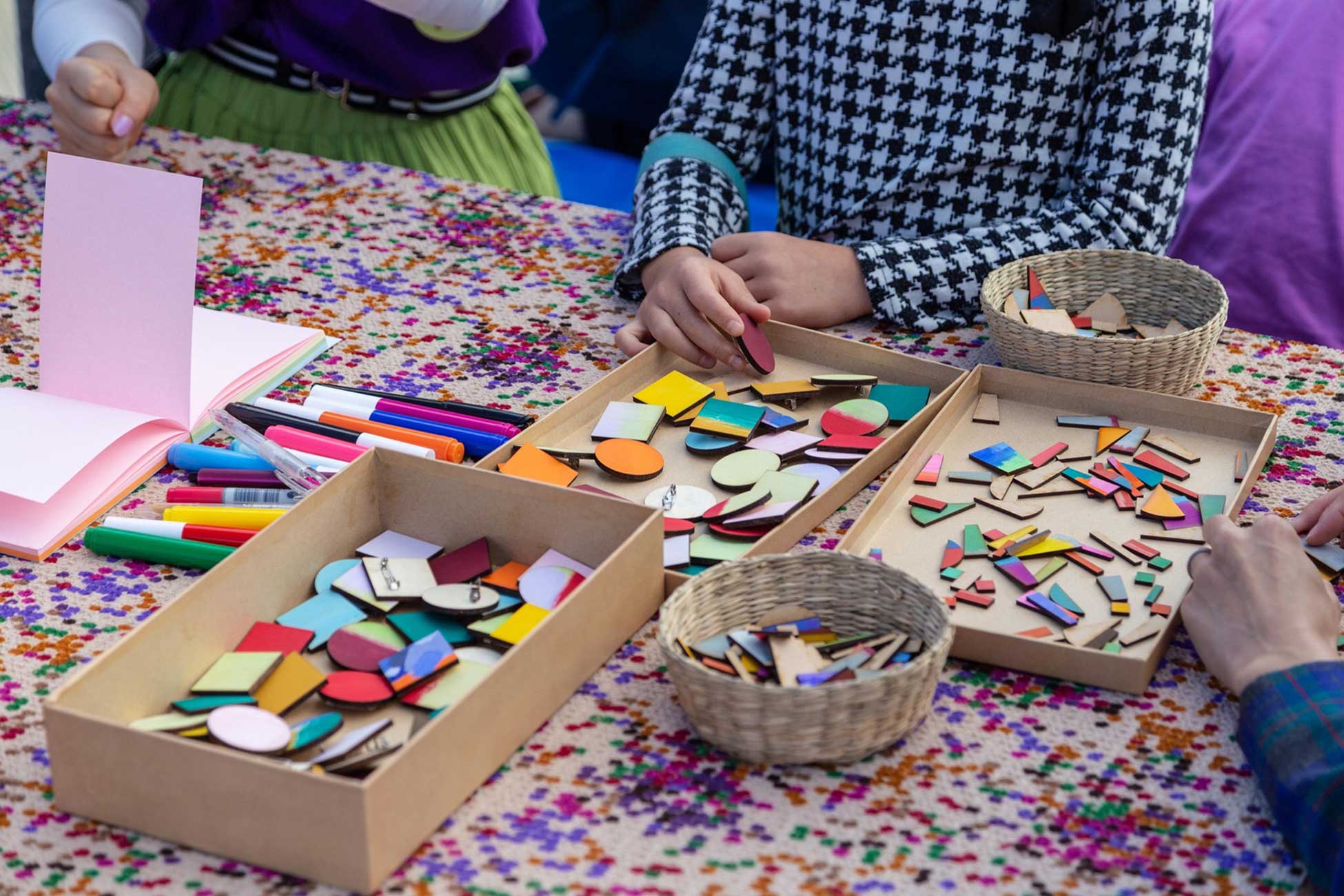 様々な色や形の木材パーツを組み合わせてブローチを作るワークショップです。2018年11月10日(土)に成安造形大学で開催された「マルシェア実」でのワークショップとして企画しました。ただものづくりを体験できるだけでなく参加者同士が自然に交流しイベントの思い出を共有できるような仕組みもつくっています。