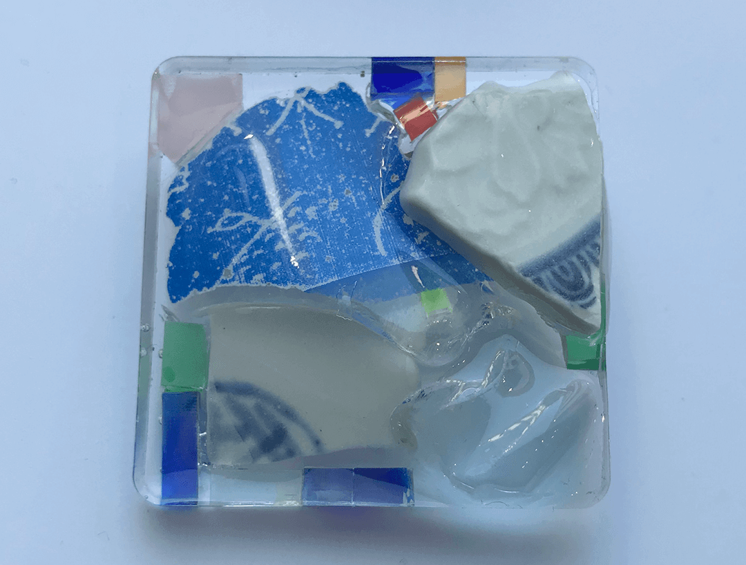 拾ってきた漂流物やレーザ加工の際に出たアクリルの端材を組み合わせて構成しUVレジンで固めています。中学生ぐらいの参加者が作った作品。プルタブをかっこよく使いこなしています。
