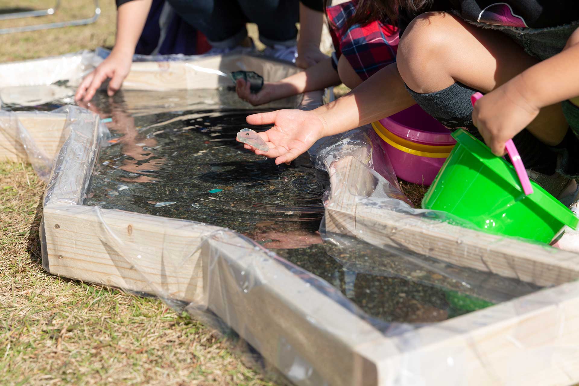 びわ湖の形をした浅いプールに水を張って砂利の中に漂流物を隠し、参加者にブローチのパーツを探してもらうところから始めました。