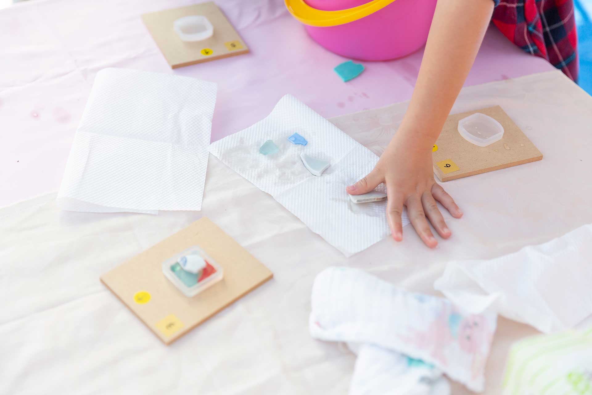 当初は拾った漂流物を、シーグラスや陶器など種類ごとにケースに仕分け、そこからパーツを選び作ってもらうというスタイルをとっていました。しかしこの漂流物を使ったものづくりの醍醐味は実際に自分で拾ってパーツを見つける楽しさにあると考え、このワークショップでは拾う(見つける)楽しみを加えました。