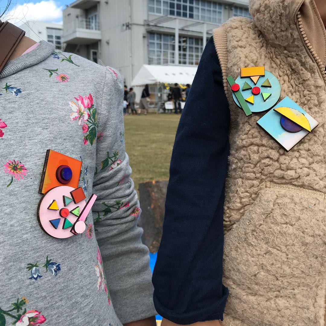様々な色や形の木材パーツを組み合わせてブローチを作るワークショップです。2018年11月10日(土)に成安造形大学で開催された「マルシェア実」でのワークショップとして企画しました。ただものづくりを体験できるだけでなく参加者同士が自然に交流しイベントの思い出を共有できるような仕組みもつくっています。