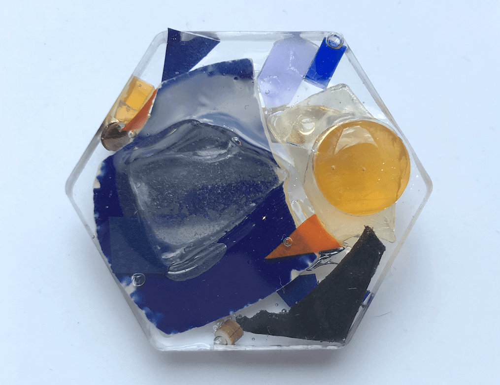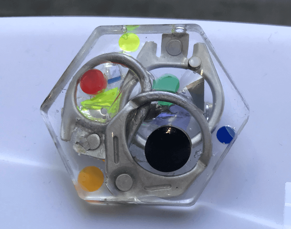 拾ってきた漂流物やレーザ加工の際に出たアクリルの端材を組み合わせて構成しUVレジンで固めています。中学生ぐらいの参加者が作った作品。プルタブをかっこよく使いこなしています。