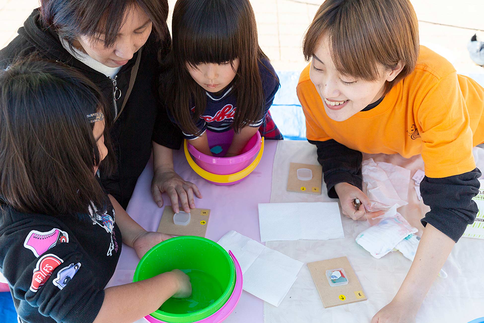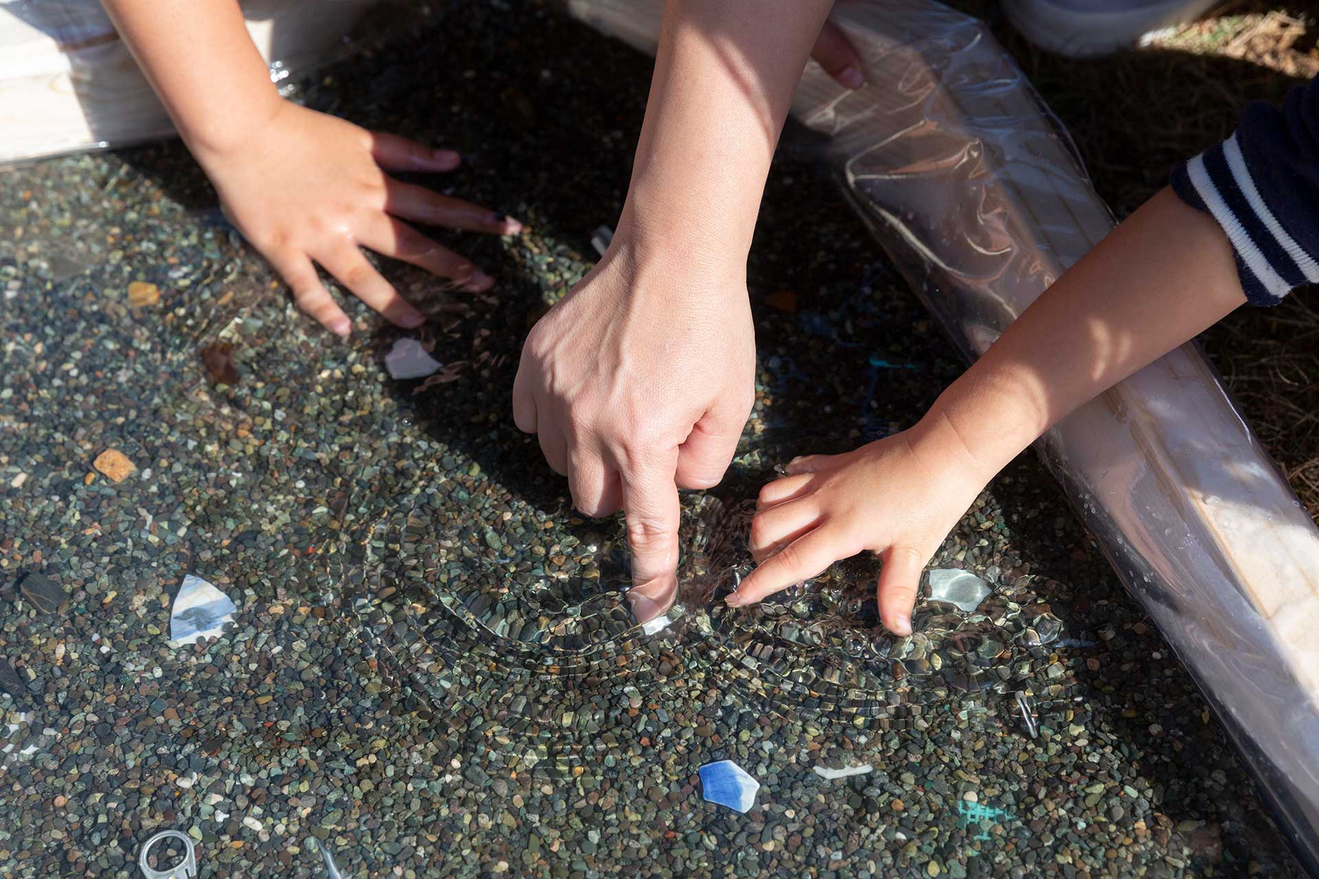 びわ湖の形をした浅いプールに水を張って砂利の中に漂流物を隠し、参加者にブローチのパーツを探してもらうところから始めました。